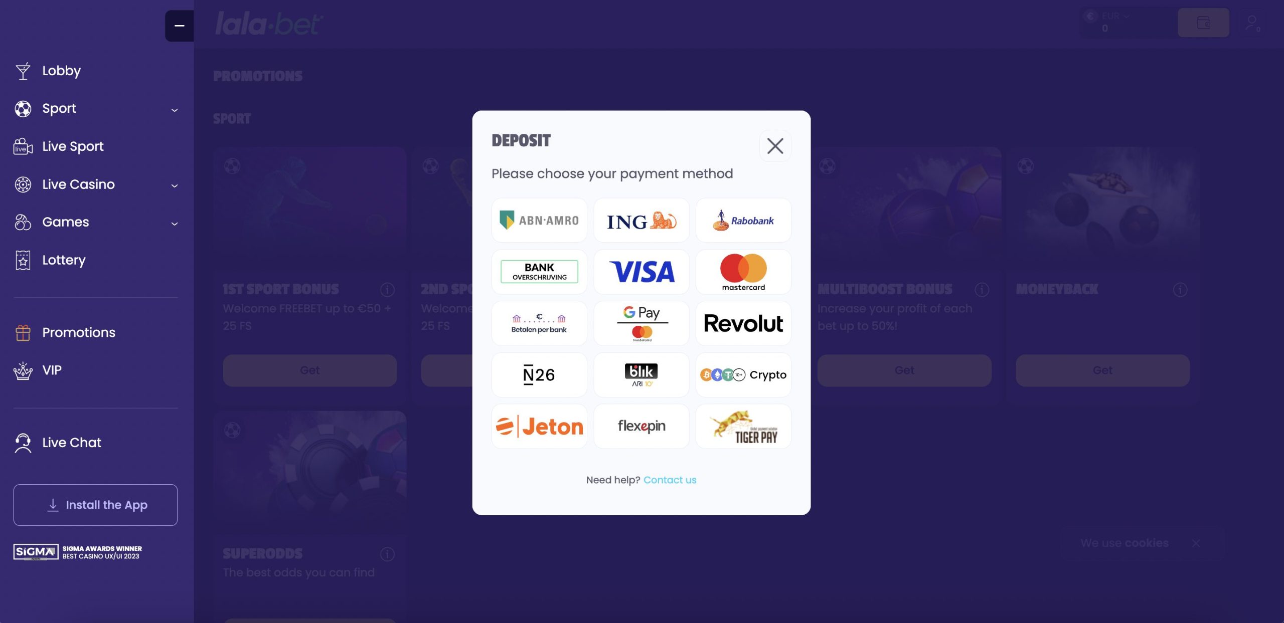 Je kunt direct hulp krijgen door de online chatfunctie te activeren. Deze functie, die 24/7 beschikbaar is, is de voorlaatste optie in het dropdownmenu aan de linkerkant en wordt bemand door een getrainde klantenservicemedewerker. Deze aanpak is de beste optie voor eenvoudige tot middelzware problemen. Als de live chat niet meer voldoende ondersteuning biedt, kunt u het probleem melden door een e-mail te sturen naar support@lala.bet. Een ervaren klantenservicemedewerker zal uw e-mail, inclusief eventuele screenshots, grondig bekijken. Na het versturen van uw e-mail kan het tot 1 dag duren voordat u een reactie ontvangt.